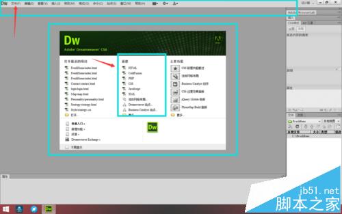 2、進入后,在中間區域的居中位置,可以快捷的新建網頁文件及其他文件,也可以用文件-》新建的方式新建文件,此處采用文件新建。