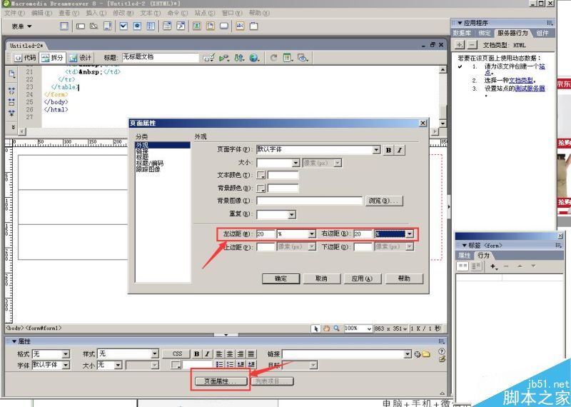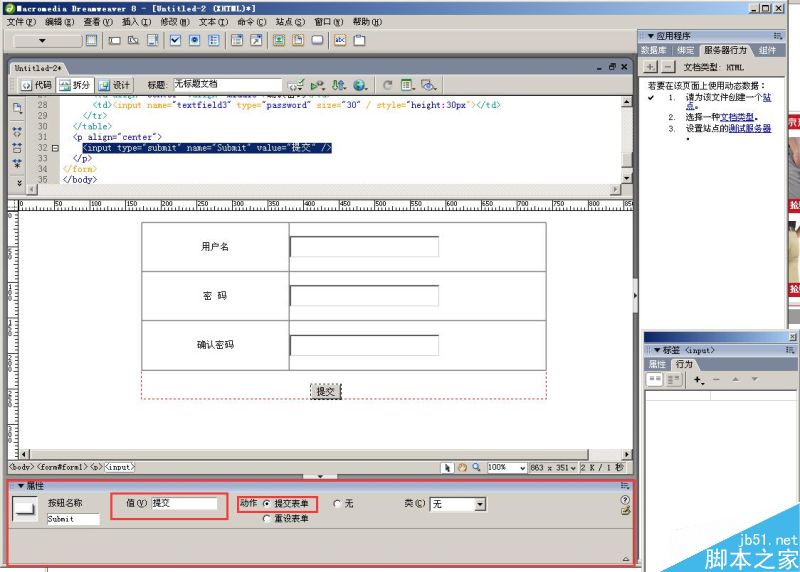 10、設置屬性,值為“提交”,動作為“提交表單”,如圖所示;