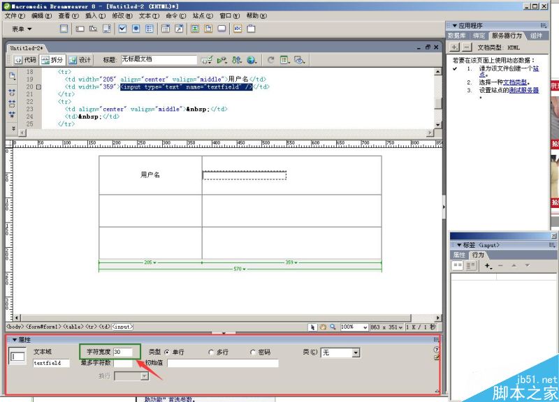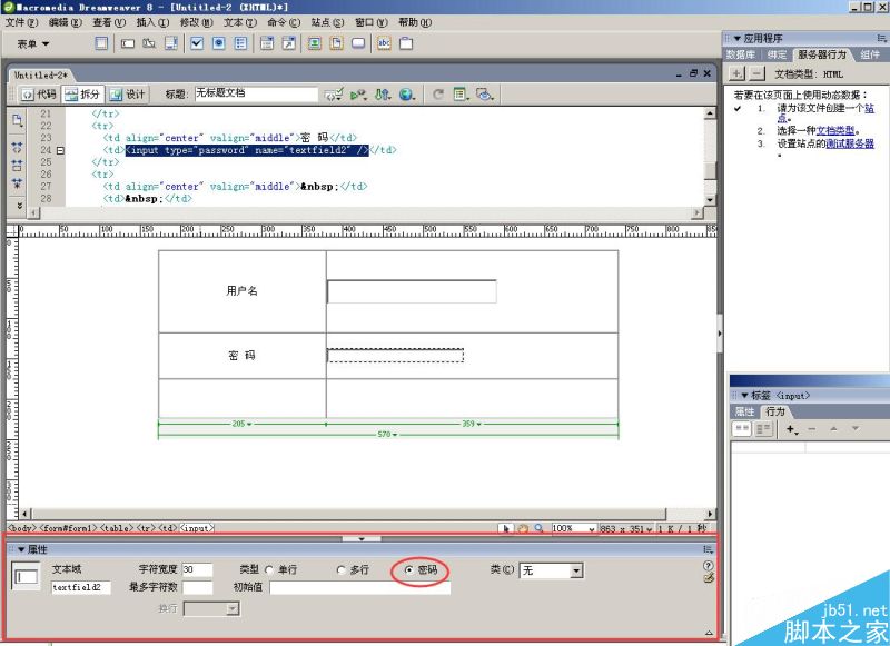 7、在第二行左側的單元格,輸入文字“密碼”,插入文本域,步驟和上面一樣;但屬性中,要選擇“密碼”,如圖所示;