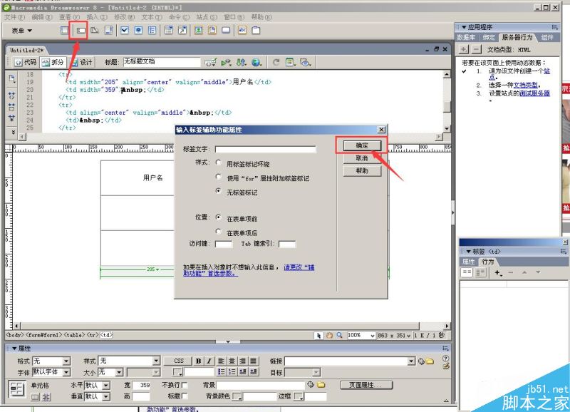 4、在表格左側的第一個單元格輸入文字“用戶名”,然后點擊上方的“文本域”,彈出“輸入標簽輔助功能屬性”對話框,直接點擊確定即可,如下圖所示;