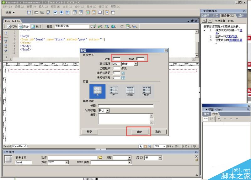 2、在表單中插入“表格”,彈出一個“表格”對話框,設置表格,參數如下圖所示。