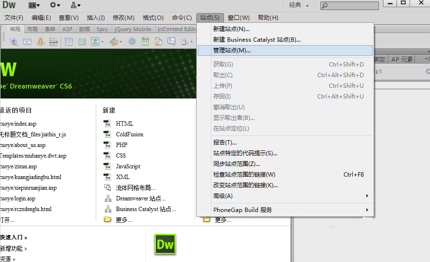 2、點(diǎn)擊菜單中的“站點(diǎn)”,選擇“管理站點(diǎn)”。