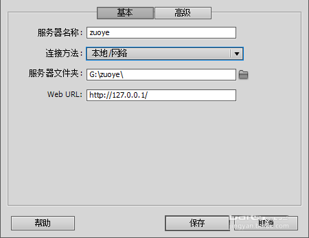 5、然后輸入服務(wù)器名稱、連接方法選擇為“本地/網(wǎng)絡(luò)”、選擇網(wǎng)站所在文件夾、WebURL輸入http://127.0.0.1/,然后點(diǎn)擊保存。