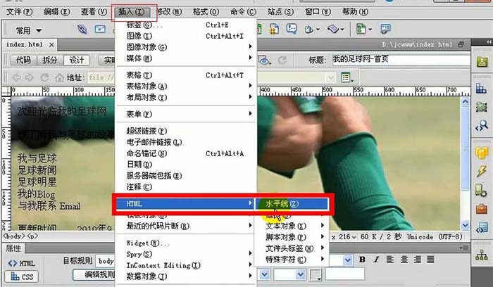 4、水平線的添加;選中要插入的位置-插入-HTML-水平線修改長度與對齊方式可自定義,選中水平線點擊代碼可查看到水平線代碼已被選中點擊字符末端選中color(顏色)按下f12預覽效果