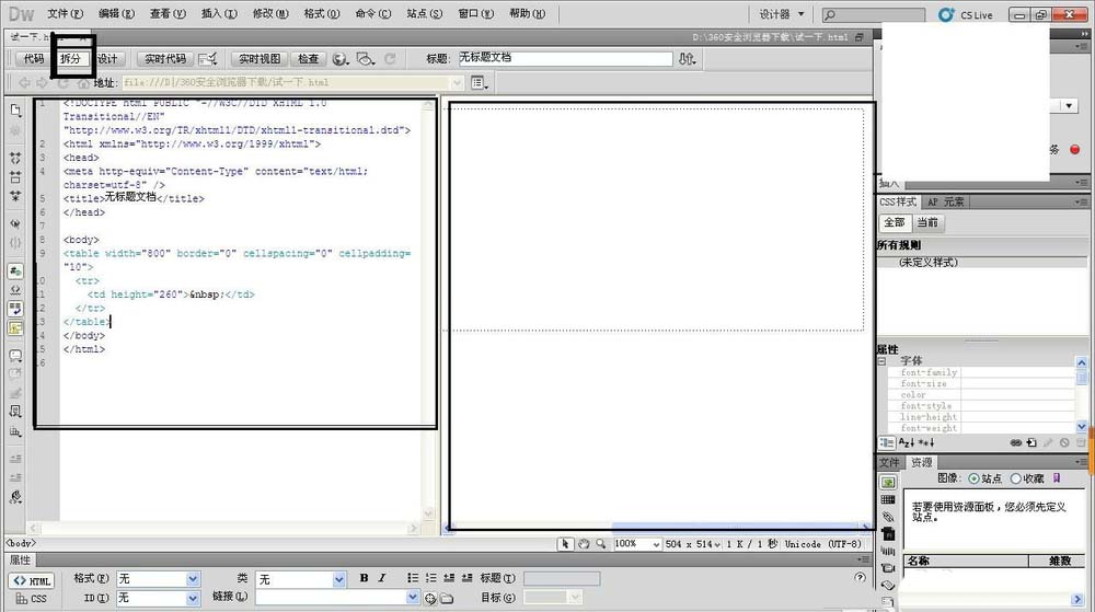2、然后給表格加一個背景,就是我們自己需要的背景素材。方法是,選中單元格。然后選擇拆分,這時候,可以看到,欄目的右側是我們設計的頁面,左面就變成了一個代碼頁。
