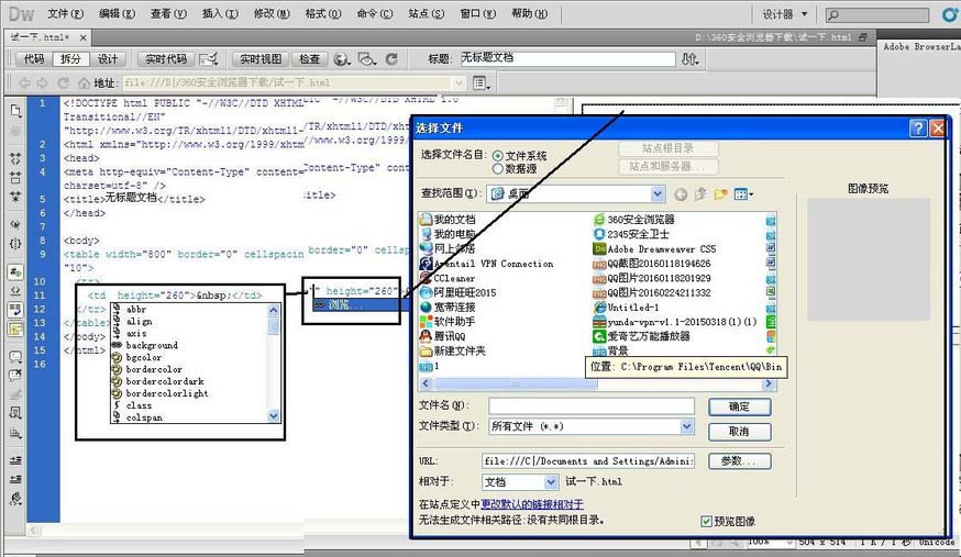 3、這時候,看一下左側的代碼頁面,有一個“td”,鼠標放在這里,然后按一下空格。會出現很多選項,這里面就是單元格的參數,找到background,雙擊確定,出現“瀏覽”之后,選擇自己的背景圖像。