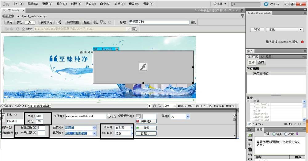 5、然后,關鍵的在這里,下面的屬性設置欄,其他的都好說,只是,Wmode這里,更改為“透明”。其他的都根據自己的需要設置。