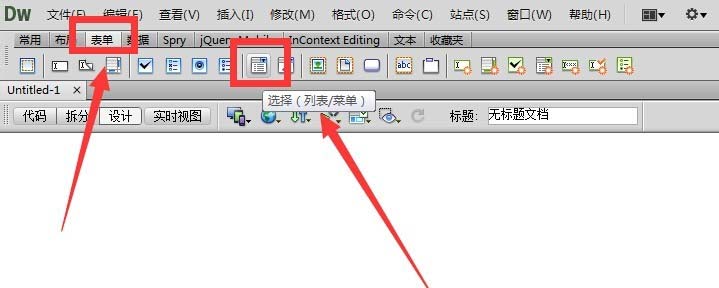 4、或者在菜單欄下方有個表單選項的圖標,鼠標放上去顯示“選擇(列表/菜單)”然后點擊,也可以插入下拉菜單。