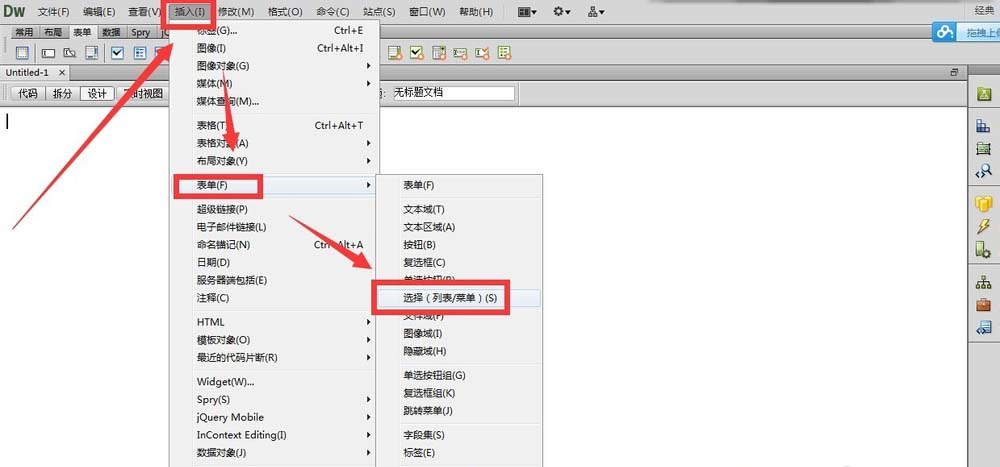 3、新建好網頁之后,在設計頁面,點擊插入——表單——選擇(列表/菜單),這樣就可以插入一個可選擇的下拉表單了。