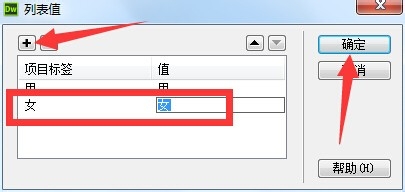 9、接著點擊加號,添加新的下面標簽和值,都填上女。然后點擊確定按鈕。