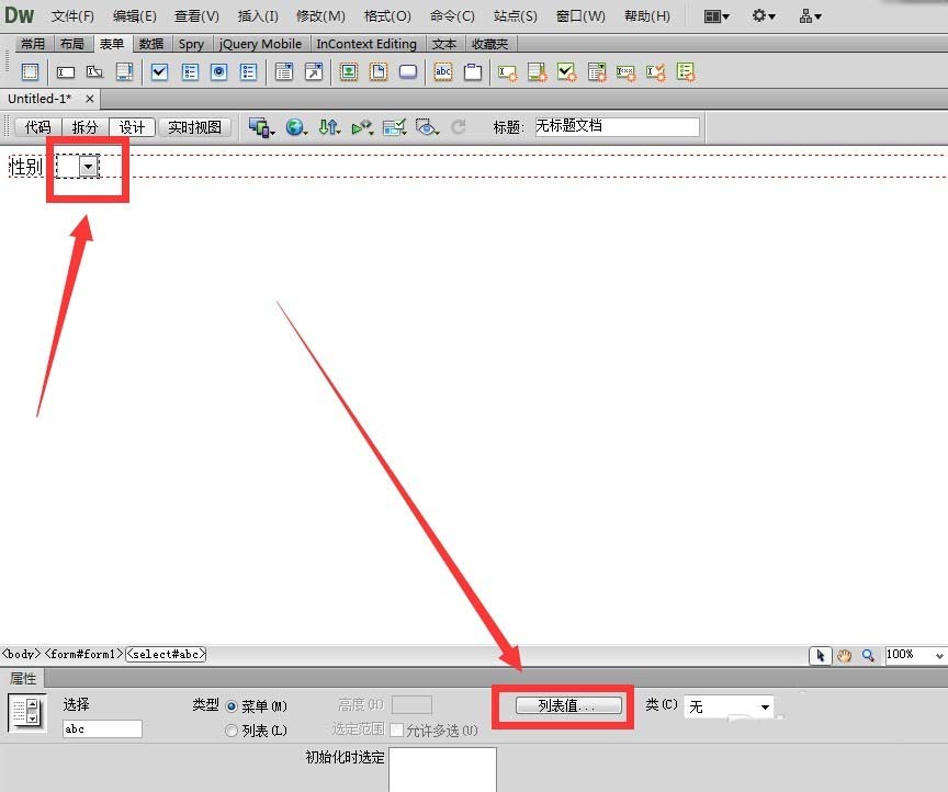 7、這時,下拉菜單插入到頁面中了,點擊下方的列表值,給你的下拉菜單添加內容。
