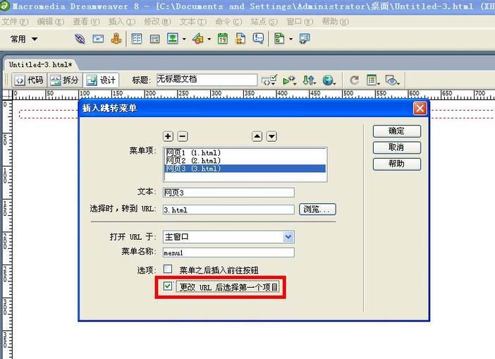 1、在“插入跳轉菜單”對話框最下面有個“更改URL后選擇第一個項目”,如果勾選了它,則在跳轉后會回到初始狀態;不勾選它,則在跳轉后不回到初始狀態。