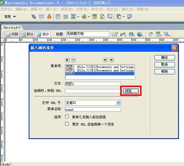 5、選定“插入跳轉菜單”對話框中的菜單項,單擊“瀏覽”按鈕。