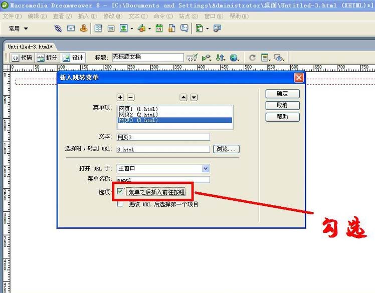 1、在“插入跳轉菜單”對話框中勾選“菜單之后插入前往按鈕”。將來網頁跳轉菜單中的菜單項選定后再單擊“前往”按鈕就能跳轉。
