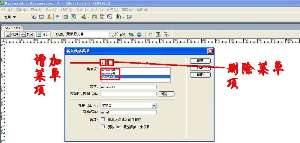 3、在彈出的“插入跳轉菜單”對話框中,單擊“+”按鈕,可以增加菜單項;單擊“-”按鈕,可以刪除菜單項,菜單項在下面的列表中顯示。