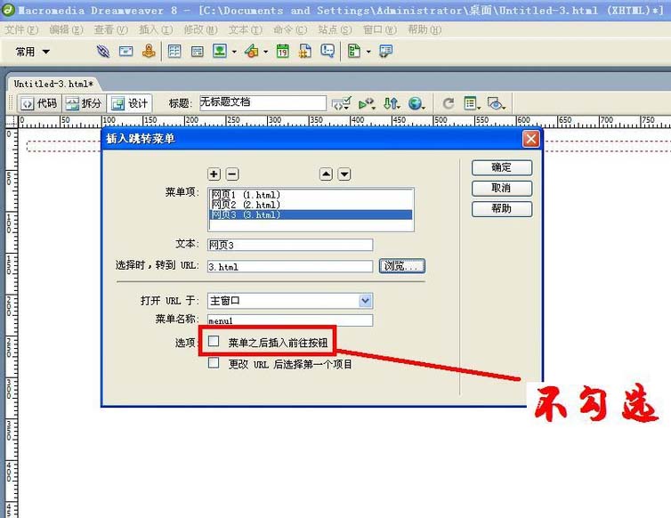 1、在“插入跳轉菜單”對話框中不要勾選“菜單之后插入前往按鈕”。將來網頁跳轉菜單中的菜單項只要單擊就能跳轉。