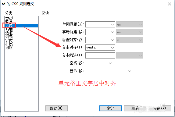 8、單擊“確定”按鈕后打開(kāi)“td的CSS規(guī)則定義”對(duì)話框,先選擇左邊“分類”選項(xiàng)中的“區(qū)塊”項(xiàng),我們把“文本對(duì)齊”方式設(shè)置為“center(居中)”,讓單元格中的文本都居中對(duì)齊。