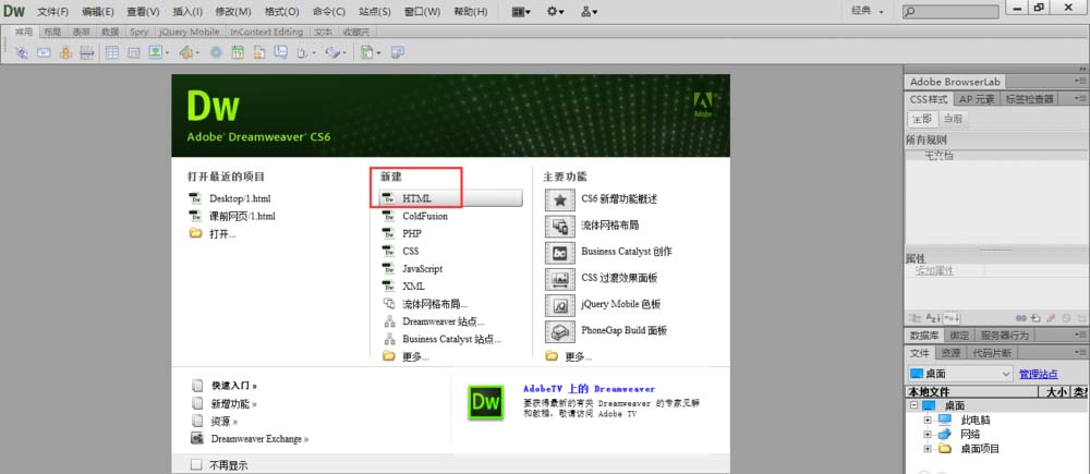 1、啟動(dòng)Adobe Dreamweaver軟件,單擊歡迎界面窗口中的新建HTML按鈕,創(chuàng)建一個(gè)新的空白網(wǎng)頁(yè)文檔。