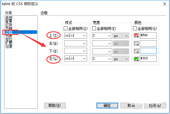 6、單擊“確定”按鈕后打開(kāi)“table的CSS規(guī)則定義”對(duì)話框,選擇左邊“分類”選項(xiàng)中的“邊框”項(xiàng),我們來(lái)對(duì)表格的外邊框進(jìn)行設(shè)置。將右邊窗口中“樣式”、“邊框”、“顏色”欄下“全部相同”的復(fù)選框取消勾選,因?yàn)閷?duì)于表格我們只設(shè)置上邊和左邊的邊框樣式,上和左的“樣式”選擇“solid(實(shí)線)”,“寬度”填入數(shù)值2px(細(xì)邊框表格此處填1像素),顏色可以任意選擇自己喜歡的顏色。單擊“確定”按鈕完成對(duì)于表格的樣式設(shè)置。