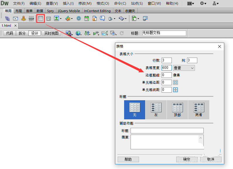 3、單擊“常用”面板當(dāng)中的“插入表格”按鈕,彈出“表格”對(duì)話框,設(shè)置插入的表格為3行3列,寬度600像素(大家可以根據(jù)自己的需要設(shè)置行列以及寬度值),邊框粗細(xì)、單元格邊距和間距均設(shè)置為0,我們等會(huì)用CSS樣式來(lái)控制它們。