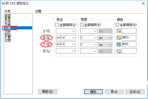 10、最后選擇左邊“分類”選項(xiàng)中的“邊框”項(xiàng),我們來(lái)對(duì)單元格的邊框進(jìn)行設(shè)置。將右邊窗口中“樣式”、“邊框”、“顏色”欄下“全部相同”的復(fù)選框取消勾選,因?yàn)閷?duì)于單元格我們只設(shè)置右邊和下邊的邊框樣式,右和下的“樣式”選擇“solid(實(shí)線)”,“寬度”填入數(shù)值2px(細(xì)邊框表格此處填1像素),顏色可以任意選擇自己喜歡的顏色。單擊“確定”按鈕完成對(duì)于單元格的樣式設(shè)置。