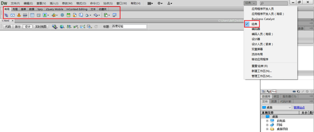 2、保存文檔后,將Dreamweaver窗口右上角的工作區(qū)布局更改為“經(jīng)典”布局方式,這樣可以讓“插入”面板顯示出來(lái)。