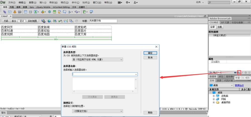 4、表格插入后,在單元格中任意輸入文本。然后單擊Dreamweaver窗口右邊“CSS樣式”浮動(dòng)面板上的“新建CSS樣式規(guī)則”按鈕,彈出“新建CSS規(guī)則”對(duì)話框。