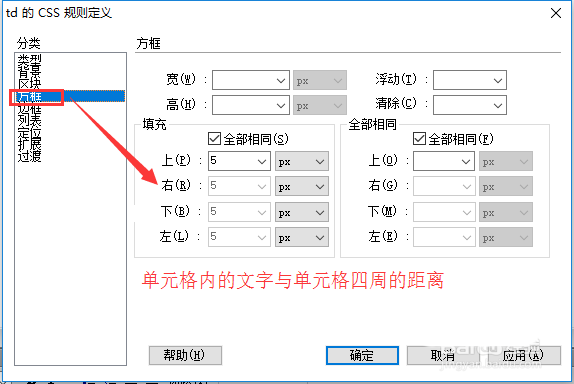 9、然后選擇左邊“分類”選項(xiàng)中的“方框”項(xiàng),默認(rèn)勾選“填充”欄中“全部相同”的復(fù)選框,填入數(shù)值5px,讓單元格內(nèi)的文字與單元格四周的距離均為5像素。