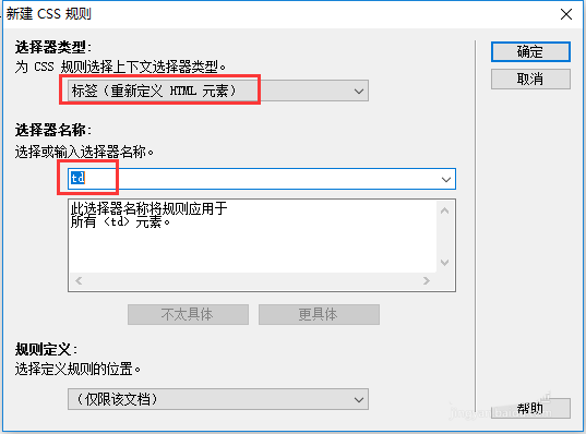 7、再次返回Dreamweaver窗口,單擊右邊“CSS樣式”浮動(dòng)面板上的“新建CSS樣式規(guī)則”按鈕,彈出“新建CSS規(guī)則”對(duì)話框。這次我們?cè)?ldquo;新建CSS規(guī)則”對(duì)話框的“選擇器名稱”的下拉列表中選擇“td”也就是單元格的標(biāo)簽,其他選項(xiàng)同上。