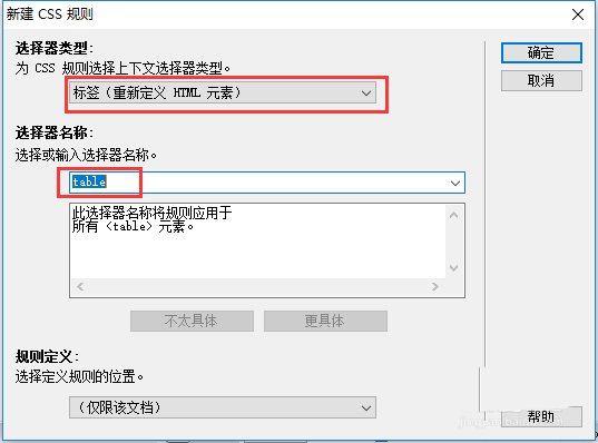 5、在“新建CSS規(guī)則”對(duì)話框的“選擇器類型”下拉列表中選擇“標(biāo)簽(重新定義HTML元素)”選項(xiàng),“選擇器名稱”的下拉列表中選擇“table”也就是表格的標(biāo)簽,“規(guī)則定義”選項(xiàng)默認(rèn)為“僅限該文檔”(如果需要對(duì)其他文檔中的表格也使用此樣式可更改此選項(xiàng))。