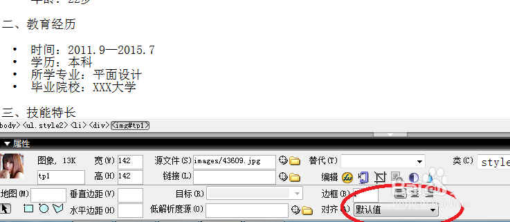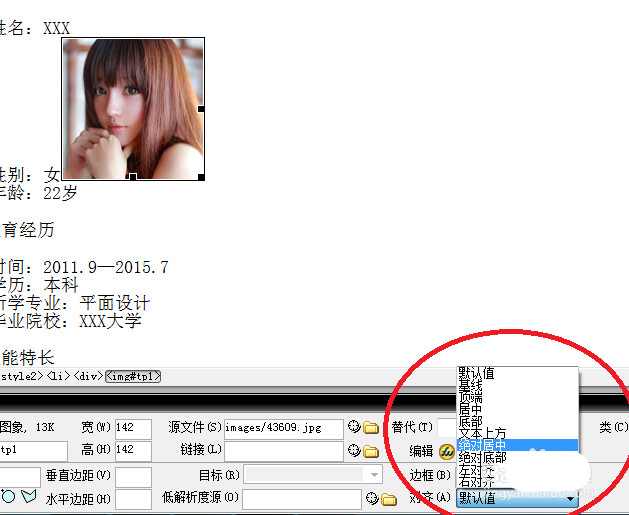 3、選中圖片,在圖片屬性中找到對齊,點擊下拉按鈕,看到對齊方式有:基線、頂端、居中、底部、文本上方、絕對居中、絕對底部、左對齊、右對齊等對齊方式。通過選擇達到預想的效果。