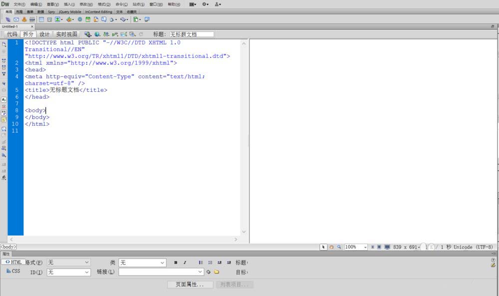 1、首先打開Dreamweaver,進行新建html文件,在“代碼,拆分,設計”三個選項中點擊拆分項,點擊后如圖所示,再插入一個3行3列的表格,查看代碼區出現的標簽及代碼。