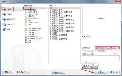 3、在新建文檔窗口,選擇“空白頁”—“HTML”,文檔類型選擇“XHTML1.0 transitional”,單擊“創建”按鈕。