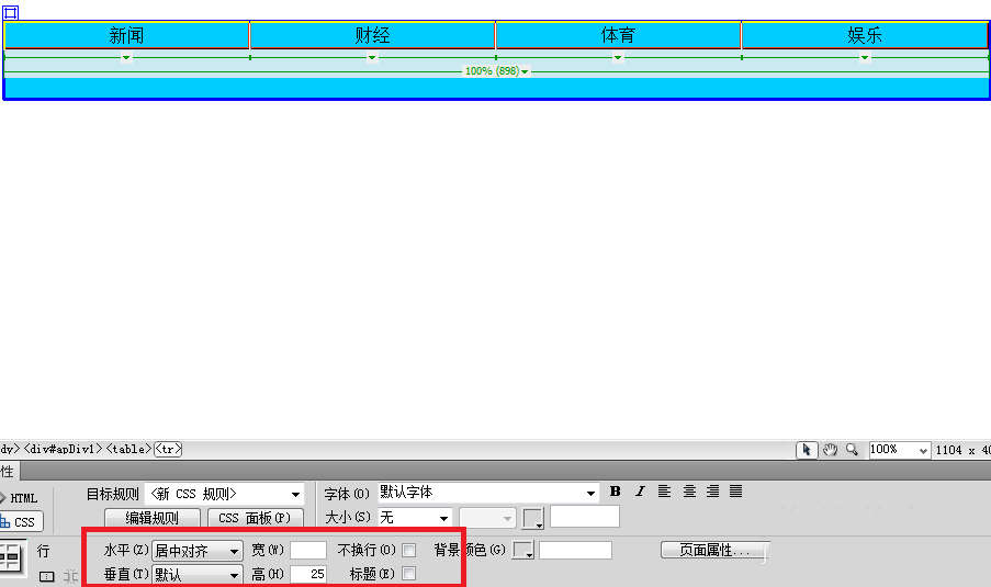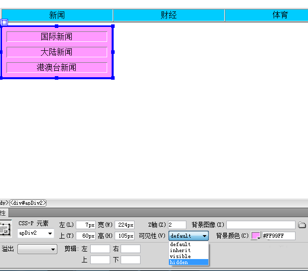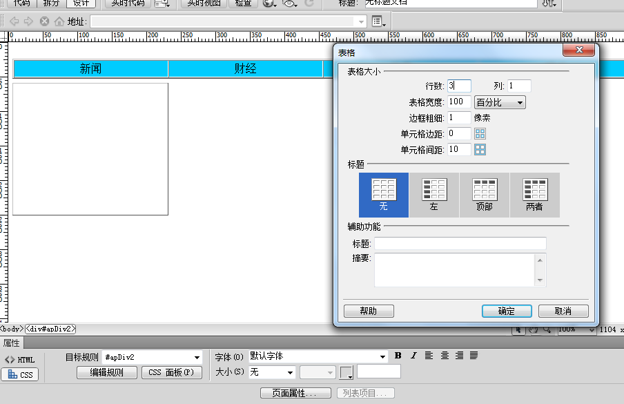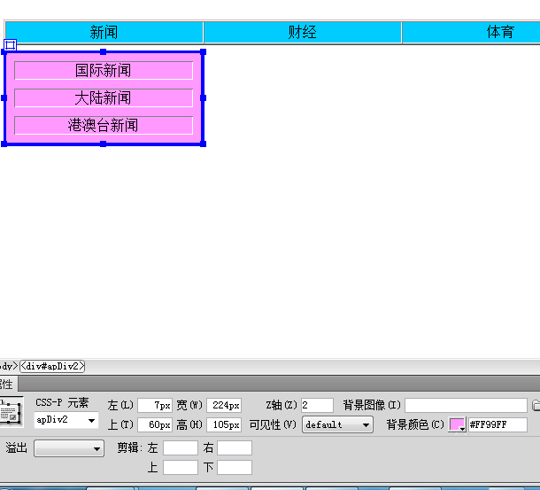 3、在每個菜單下面,創建一個圖層,比如新聞下面,并在圖層下面插入一個一列三行的表格。