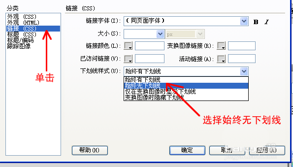 5、選擇“鏈接(CSS)”,再選始終無(wú)下劃線