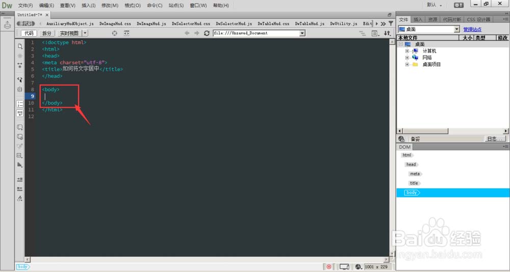 1、打開DreamWeaer軟件,在body標簽中間點擊一下,調出文字輸入框
