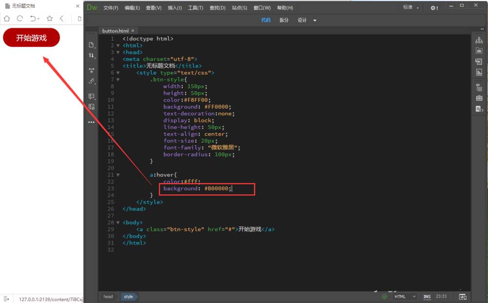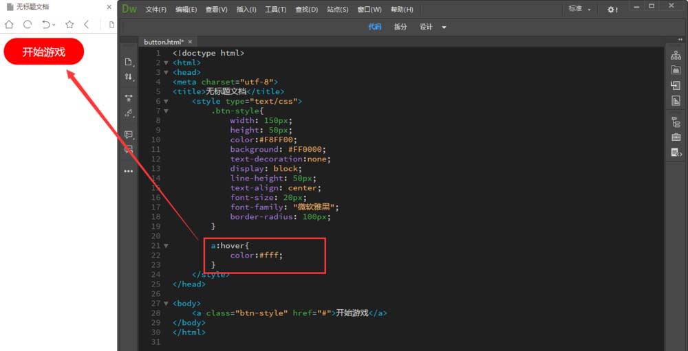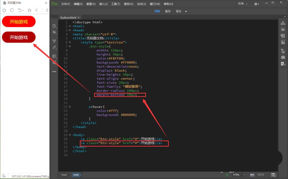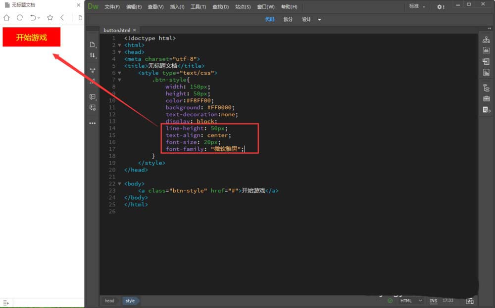 1、新建一個html文件,在body中先輸入一個a標簽,并插入一個空鏈接?!?lt;a class="btn-style" href="#">開始游戲</a>】,然后在title中插入引入內嵌樣式的代碼【<style type="text/css"></style>】。