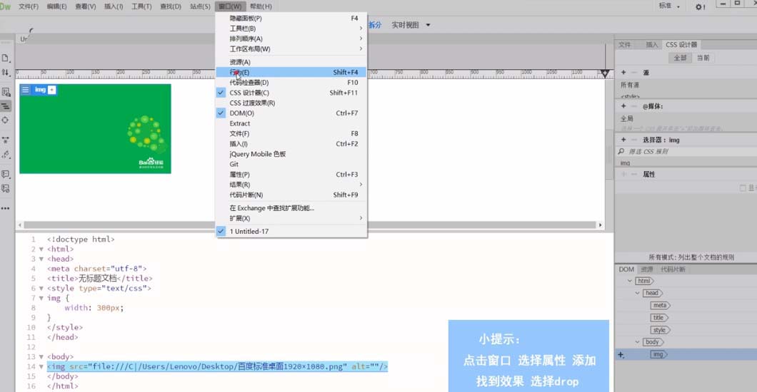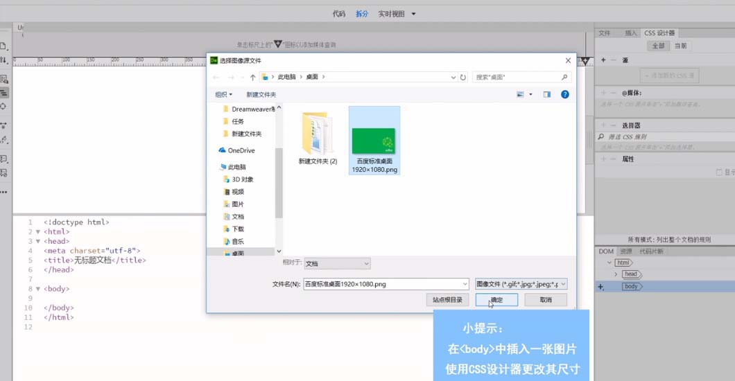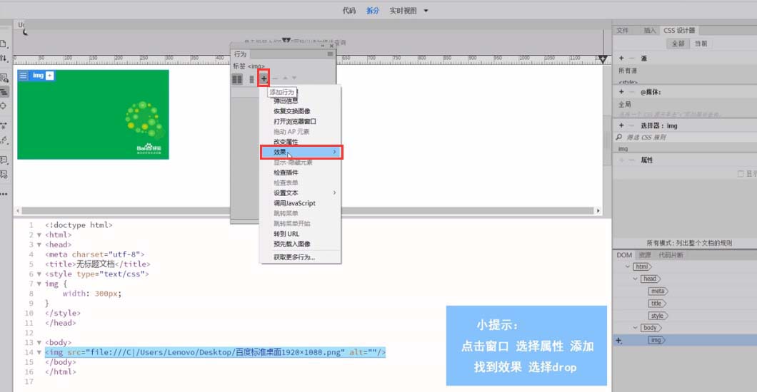 2、在中插入一張圖片,使用CSS設(shè)計(jì)器更改其尺寸大小。