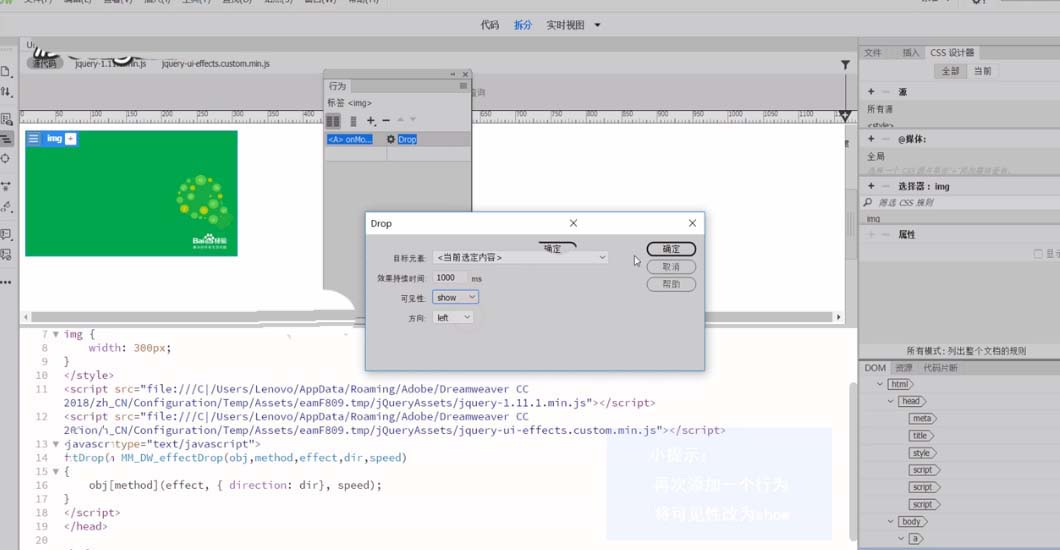 5、繼續(xù)點(diǎn)擊加號(hào),選擇“效果”,點(diǎn)擊“drop”,將可見性改為“show”,然后在彈出的窗口中點(diǎn)擊“確認(rèn)”,將觸發(fā)事件改為“onMouseOut”。