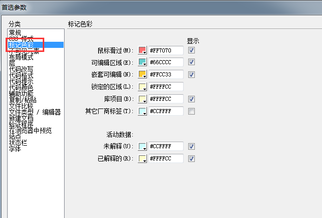 2、在【首選參數(shù)】里,可以看到有很多選項,這里選擇【標(biāo)記色彩】,如圖所示,各區(qū)域的背景色彩都可以在這里設(shè)定,【顯示】列要勾上才能生效