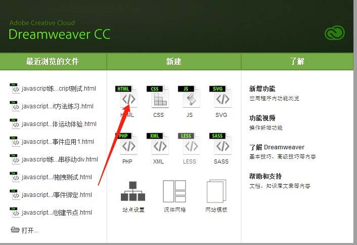 1、打開Dreamweaver cc 2014軟件,選擇建立html界面,里面自動生成一些必要代碼的代碼格式,節省時間。