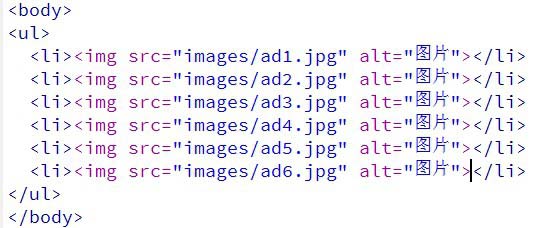 <ul> <li><img src="images/ad1.jpg" alt="圖片"></li> <li><img src="images/ad2.jpg" alt="圖片"></li> <li><img src="images/ad3.jpg" alt="圖片"></li> <li><img src="images/ad4.jpg" alt="圖片"></li> <li><img src="images/ad5.jpg" alt="圖片"></li> <li><img src="images/ad6.jpg" alt="圖片"></li></ul>