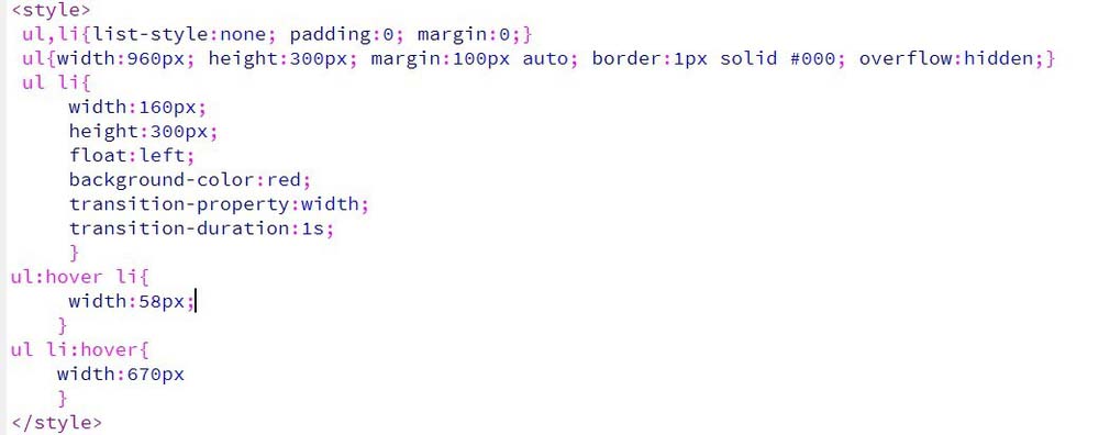 <style> ul,li{list-style:none; padding:0; margin:0;} ul{width:960px; height:300px; margin:100px auto; border:1px solid #000; overflow:hidden;} ul li{width:160px;height:300px;float:left;background-color:red;transition-property:width;transition-duration:1s;}ul:hover li{width:58px;}ul li:hover{width:670px} </style>;輸入完后,摁F12鍵,彈出頁面,可以看到圖片。