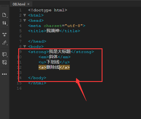 5、另外在HTML的效果添加中,還可以對文字添加其他效果,比如斜體、下劃線以及刪除線,使用方法也很簡單,建立標簽后,直接更改中間的文字即可
