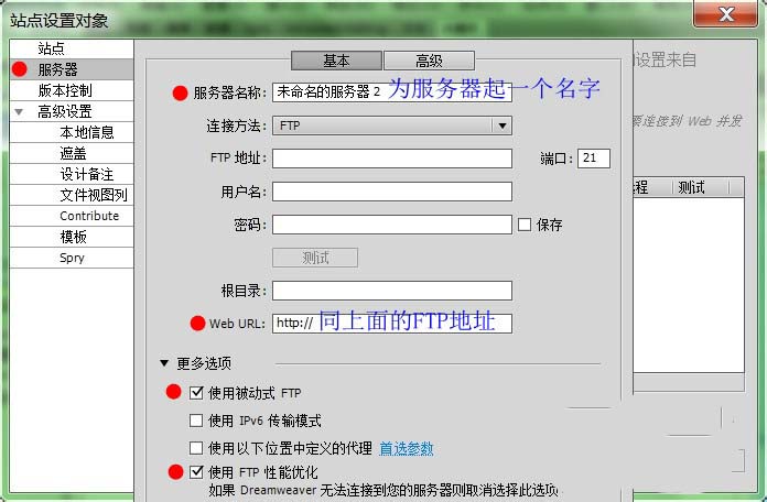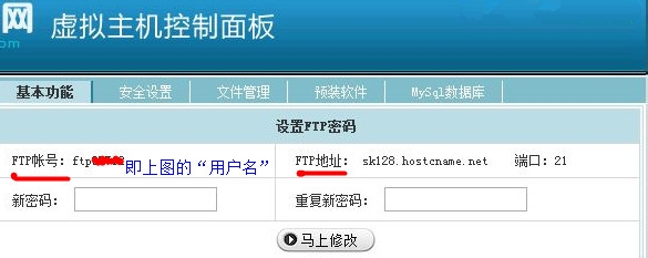 2、然后,進入你申請的網站空間的操作后臺,點擊【設置FTP密碼】,就可以看到你的FTP信息,將其填寫在下圖對應的地方。