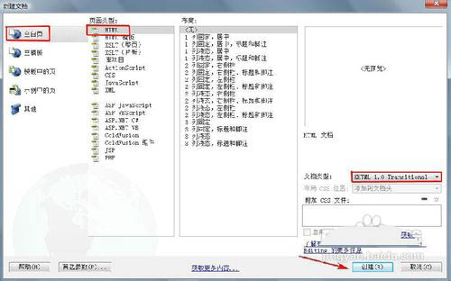 3、在新建文檔窗口,選擇“空白頁”—“HTML”,文檔類型選擇“XHTML1.0 transitional”,單擊“創(chuàng)建”按鈕。