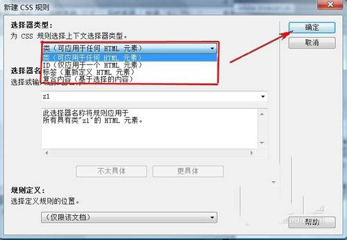 5、在“ 新建 CSS 規(guī)則” 對話框中,指定要創(chuàng)建的 CSS 規(guī)則的選擇器類型: