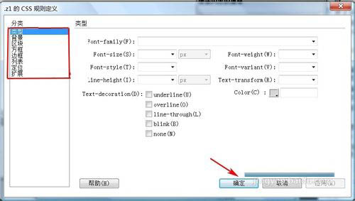 6、在“CSS規(guī)則定義”窗口中設(shè)置類型、背景、區(qū)塊、方框、邊框、列表、定位、護展中所需設(shè)置的參數(shù),然后點擊“確定”按鈕完成設(shè)置。