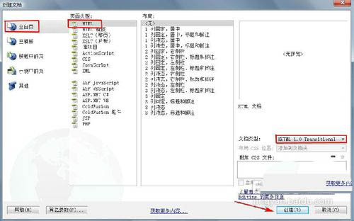 3、在新建文檔窗口,選擇“空白頁”—“HTML”,文檔類型選擇“XHTML1.0 transitional”,單擊“創(chuàng)建”按鈕。