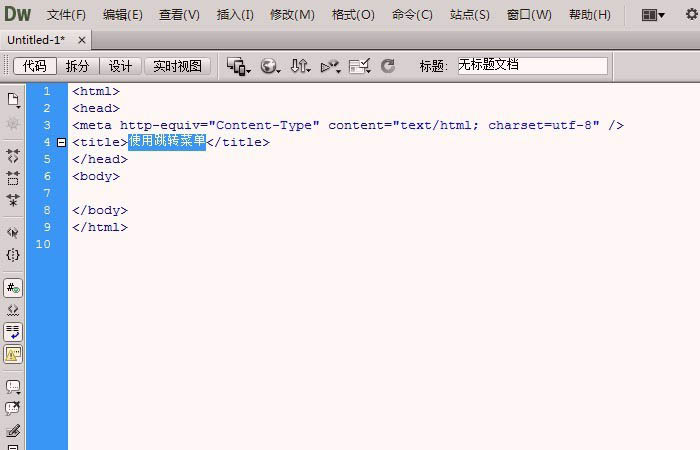 1、打開Dreamweaver軟件,鼠標(biāo)左鍵選擇新建【HTML】,在代碼窗口上,修改網(wǎng)頁(yè)title標(biāo)簽,比如使用跳轉(zhuǎn)菜單,如下圖所示。